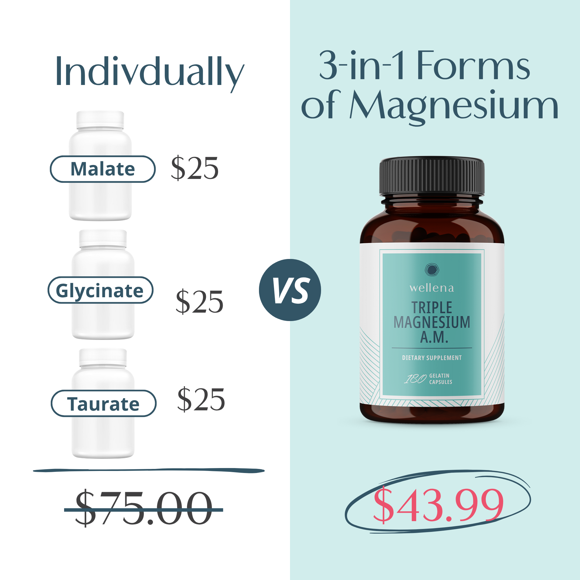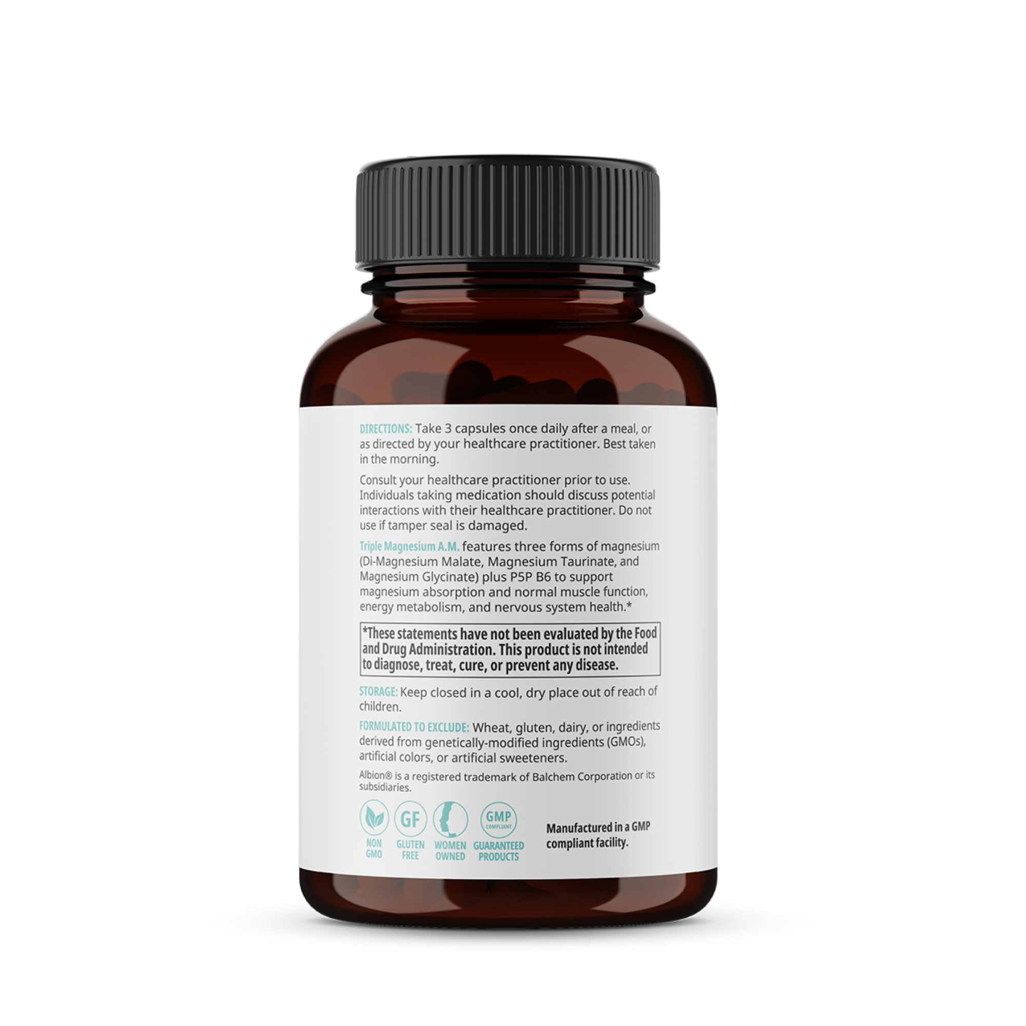 Triple Magnesium A.M. delivers three highly bioavailable forms of magnesium - malate, glycinate, and taurate - for a full spectrum of benefits in one formula.