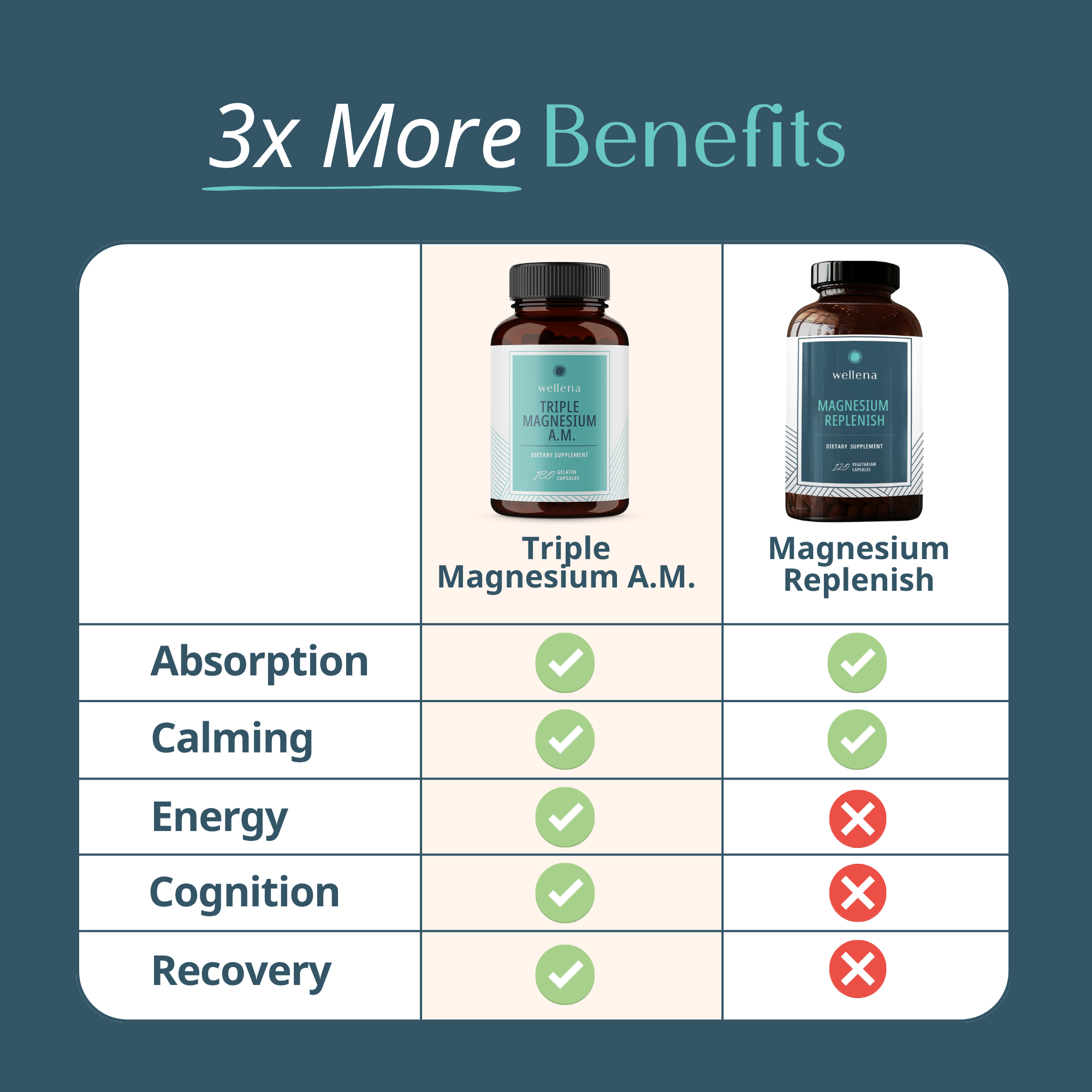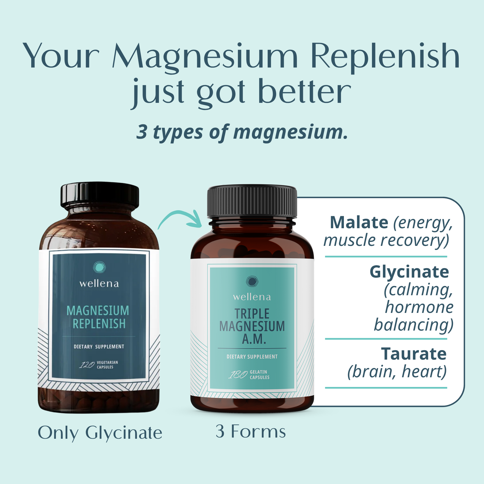 Triple Mag AM is the next generation of our best-selling Magnesium Replenish. While Magnesium Replenish contained only magnesium glycinate (ideal for evening relaxation), Triple Mag AM blends glycinate, malate, and taurate for triple the benefits: