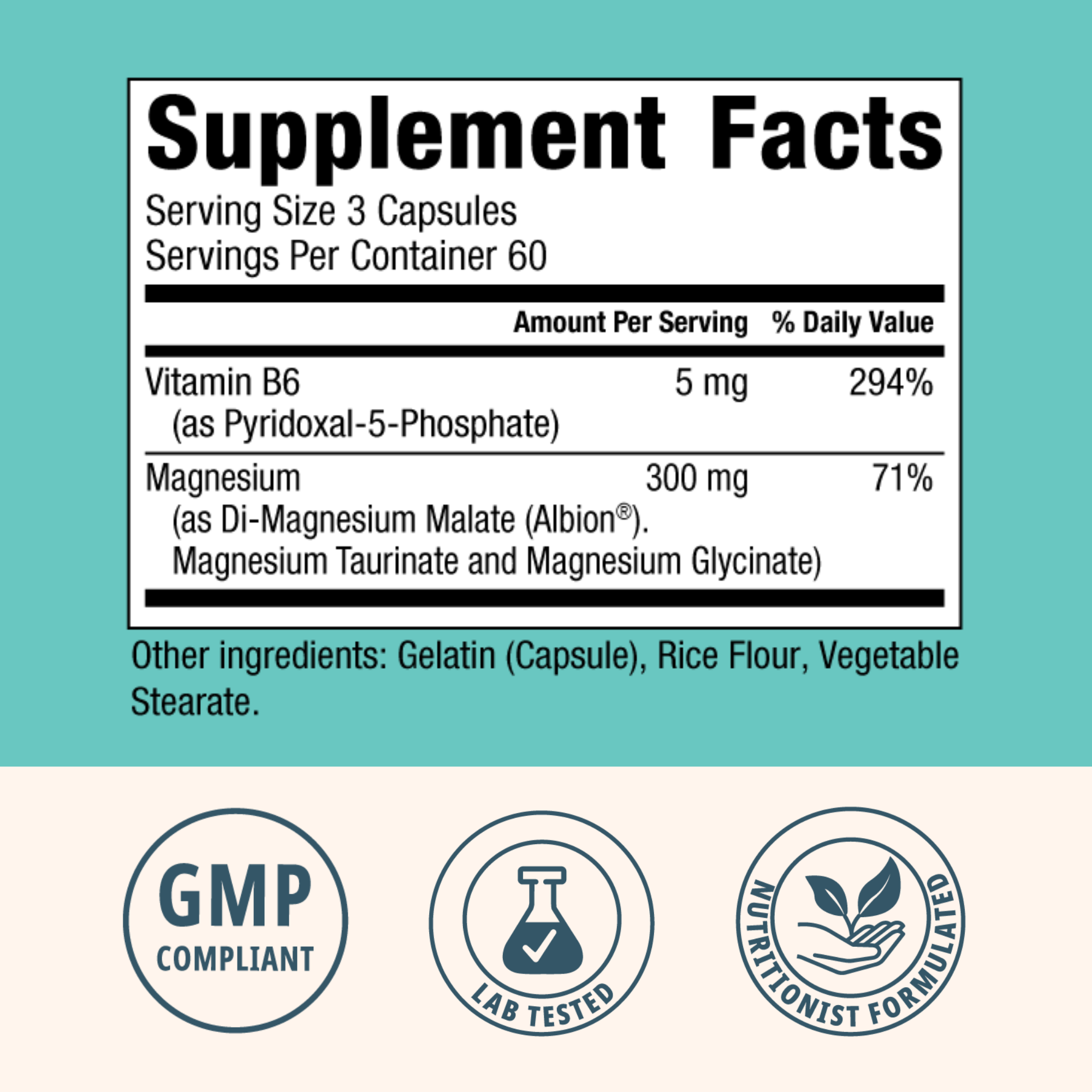 Magnesium (as Di-Magnesium Malate, Magnesium Taurinate, and Magnesium Glycinate, plus P5P B6 to support magnesium absorption and normal muscle function